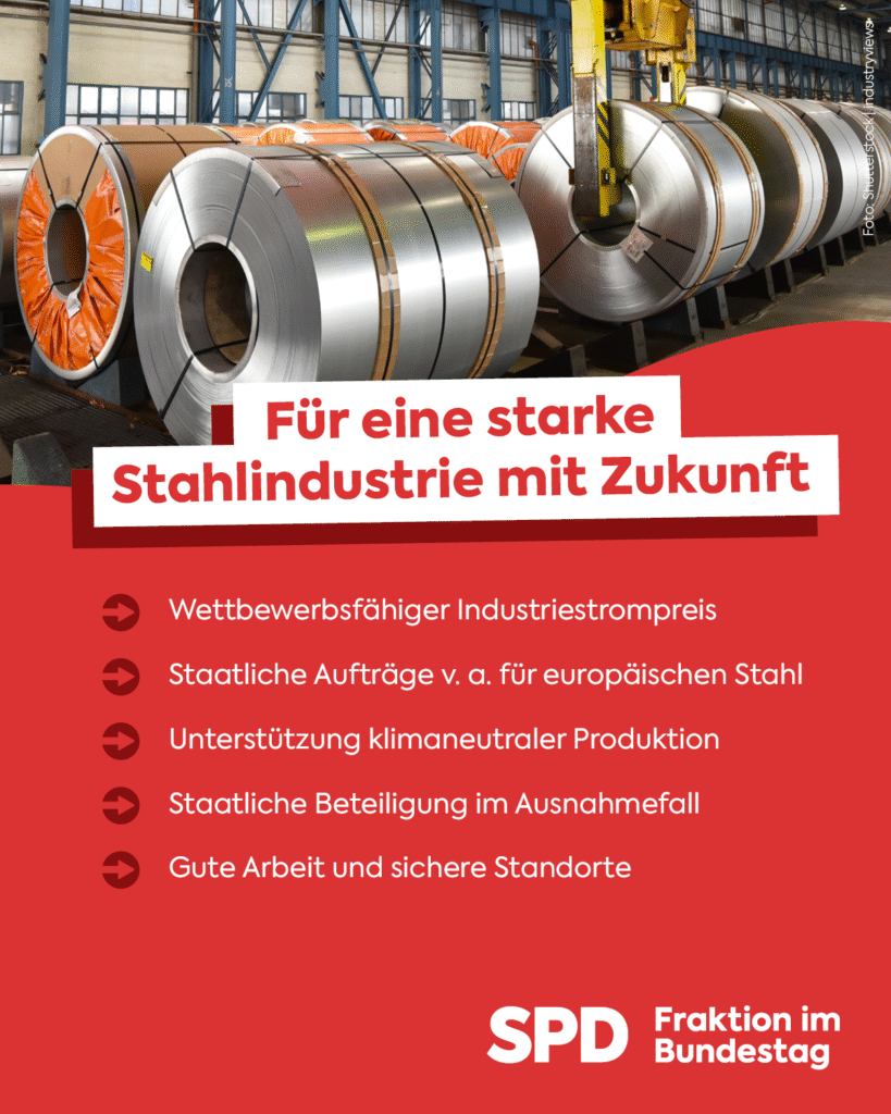 Am 6.11. findet der von Lars Klingbeil initiierte Stahlgipfel statt. Unsere Fraktion hat dazu in dieser Woche ein Positionspapier beschlossen. Für uns ist klar: Stahl ist das Rückgrat unserer Industrie – in Autos, Brücken, Maschinen – und sichert über vier Millionen Arbeitsplätze in Deutschland. Deutschland soll Stahlstandort bleiben. Die Stahlproduktion darf kein Spielball von Investmentgesellschaften wie bei Buderus sein, sondern braucht verlässliche Rahmenbedingungen. Wir brauchen einen Industriestrompreis, der CO₂-neutrale Stahlproduktion ermöglicht, den Umstieg erleichtert und ökonomischen Druck reduziert. Ebenso brauchen wir faire Wettbewerbsbedingungen, damit Dumping-Stahl unseren Markt nicht überschwemmt. Unser Ziel sind sichere Arbeitsplätze und eine starke Industrie. Ich hoffe sehr auf konkrete Ergebnisse, die rasch umgesetzt werden.