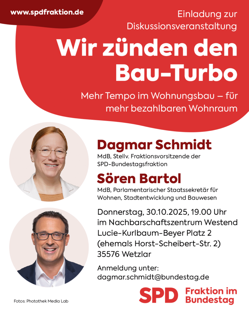 Am 30.10. ist der Parlamentarische Staatssekretär für Wohnen, Stadtentwicklung und Bauwesen in Wetzlar zu Gast und stellt den kürzlich beschlossenen Bau-Turbo vor. Gemeinsam wollen wir darüber sprechen, welche Chancen sich daraus für die Kommunen ergeben und wie unsere Infrastruktur vor Ort profitieren kann. Die Veranstaltung findet am 30.10. um 19 Uhr im Nachbarschaftszentrum im Wetzlarer Westend statt. Alle Interessierten sind herzlich eingeladen und können sich hier anmelden.